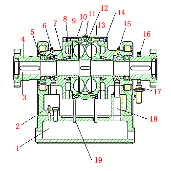| 1.底座 2.左右軸承座 3.主軸部件 4.聯(lián)軸節(jié) 5.軸承壓板 6.骨架油封 7.軸套 8、9.雙金屬軸套
